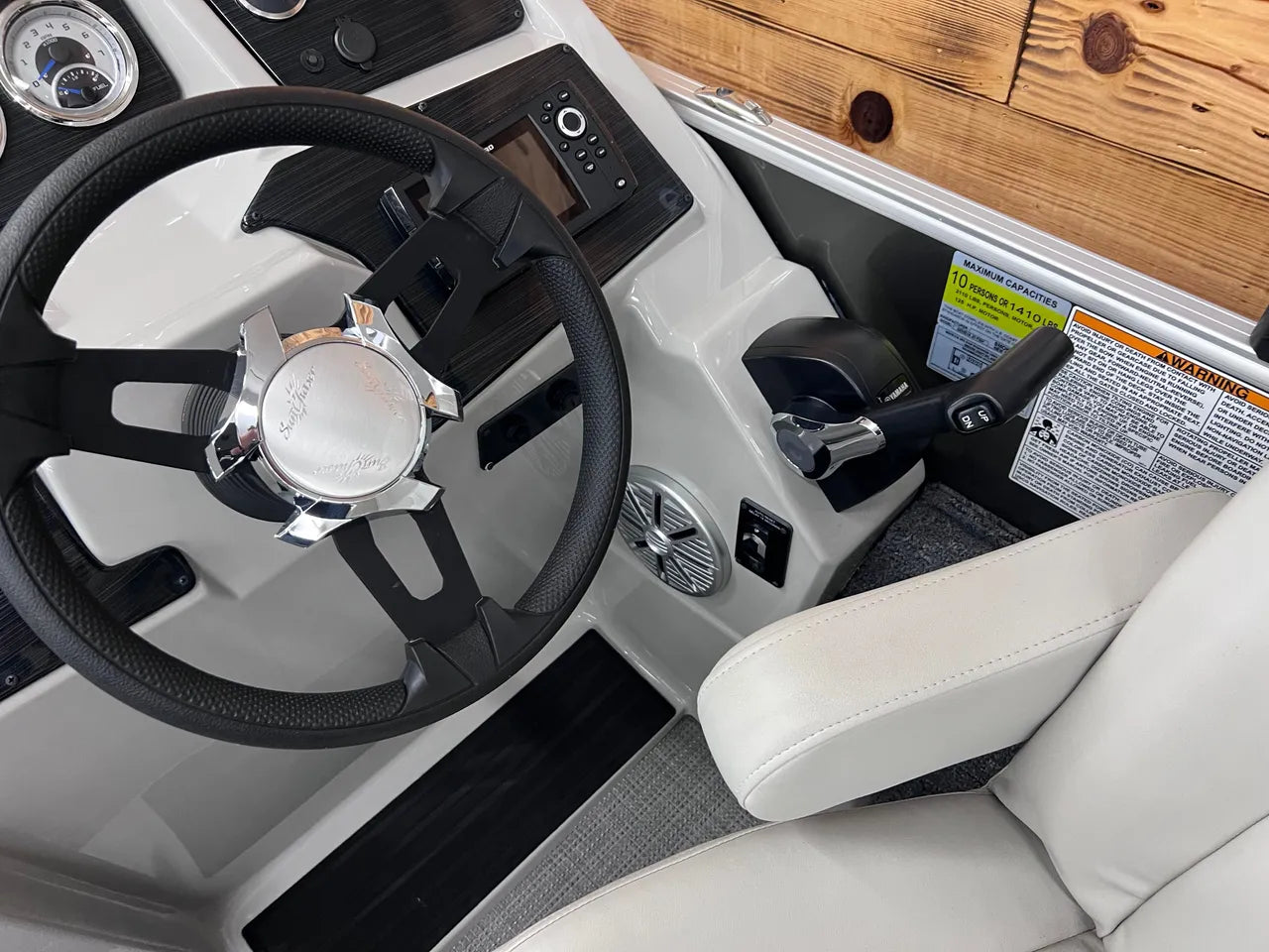 - Luxurious Comfort: Plush seating, a stylish helm, and thoughtful amenities such as a bimini top and an onboard sound system create a relaxing environment for you and your guests.