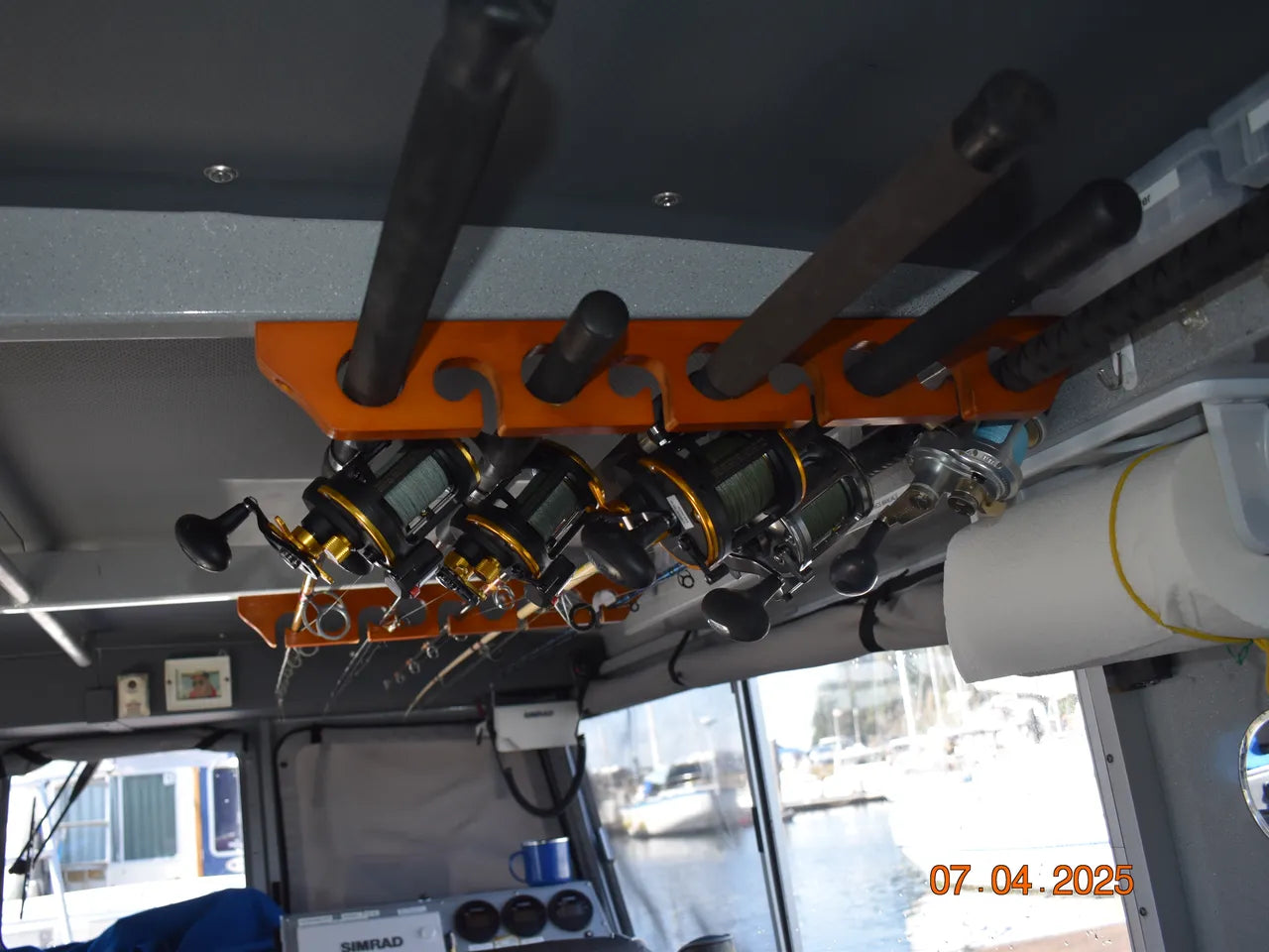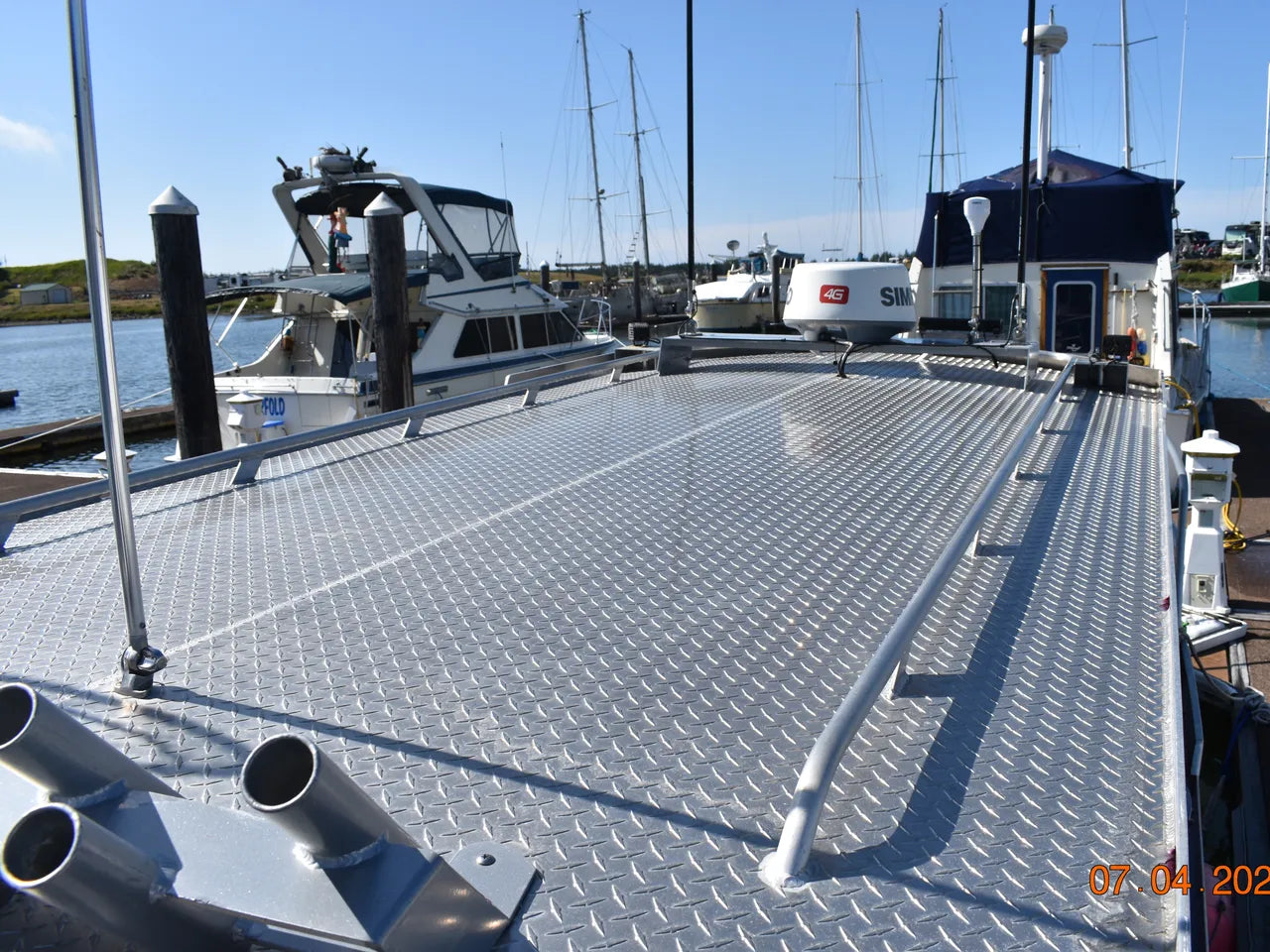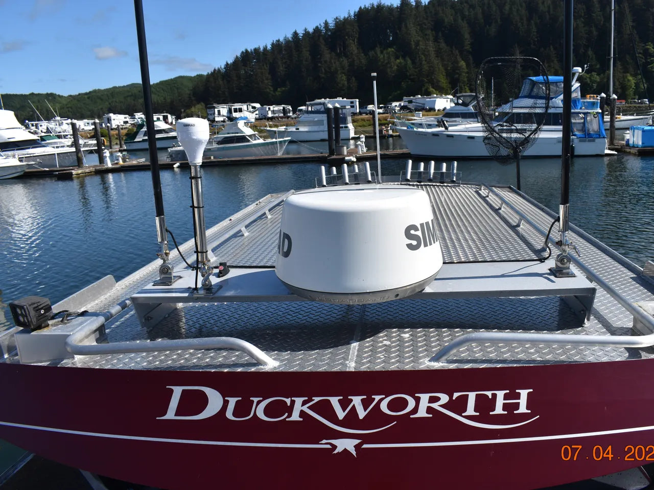 Electronics installed at the rear deck helm include overhead mounted Simrad VHF radio, overhead mounted Simrad GPS with sonar, 2 Scotty downriggers, heavy duty electric crab davit (like new), custom removable tuna outriggers, removable rubber floor mats, and dual batteries with a dual battery charging system (shore power).