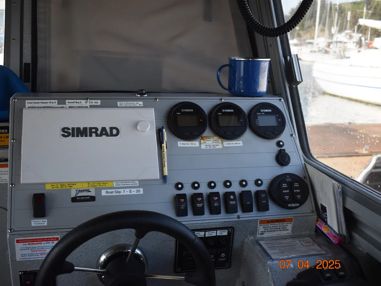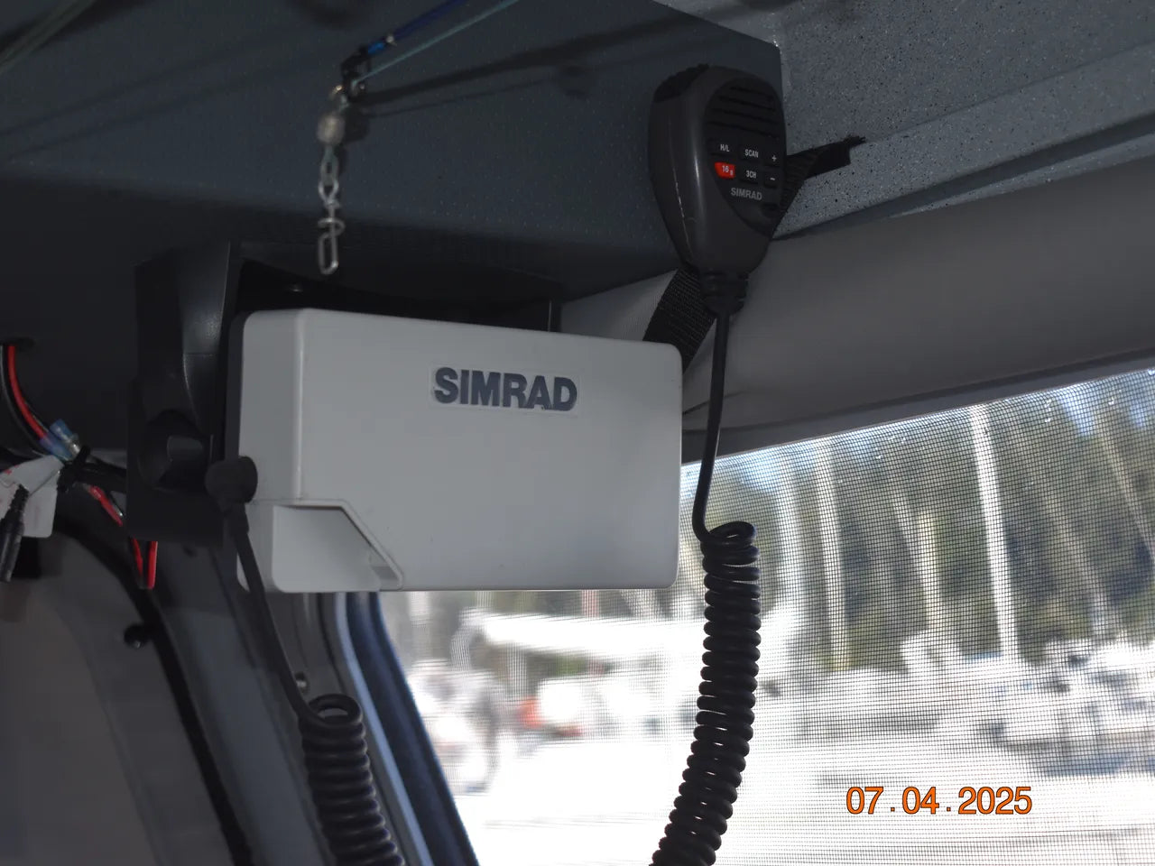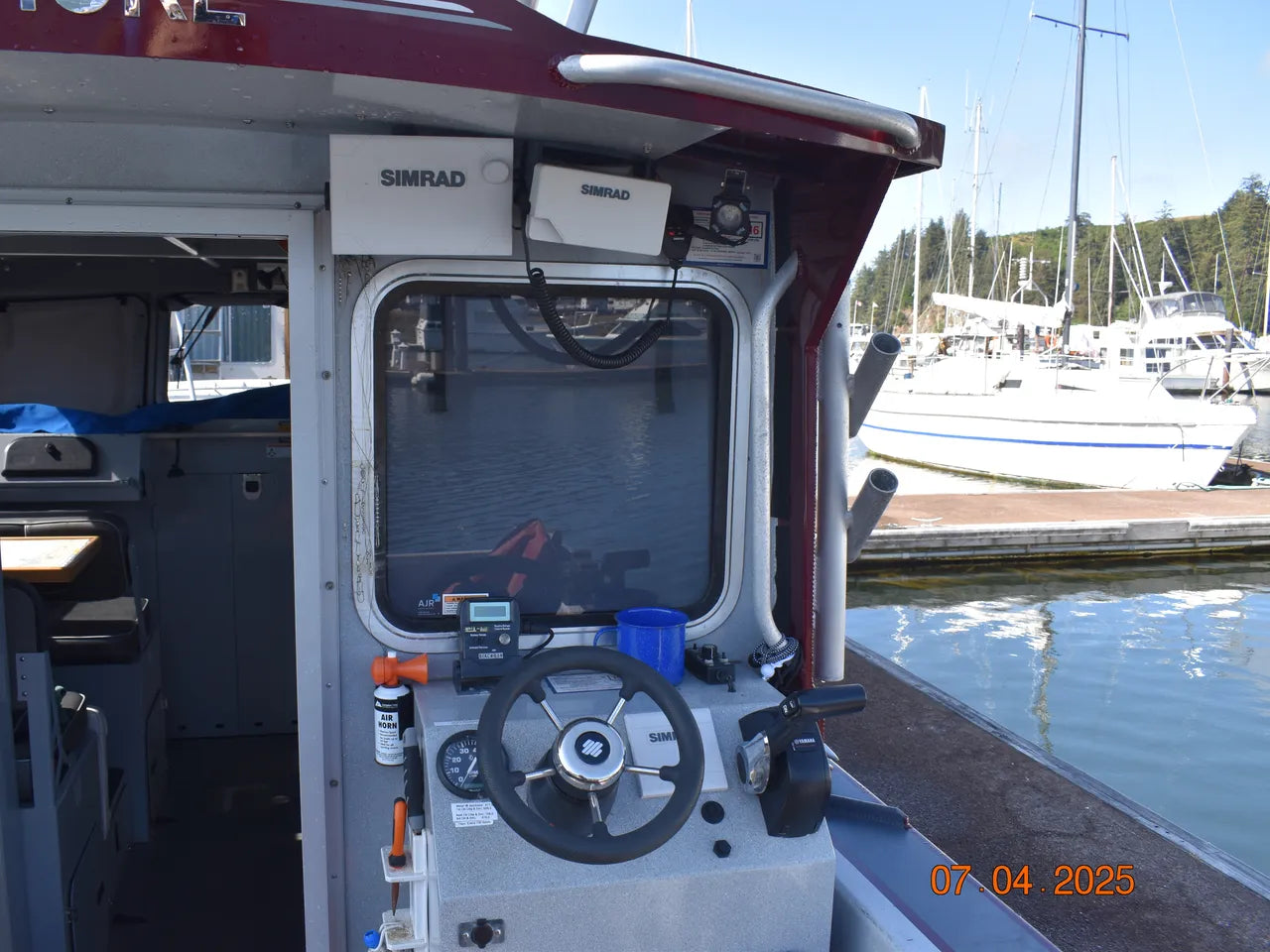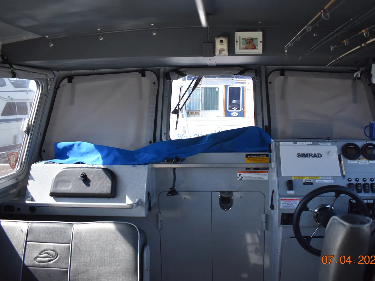 Installed main cabin electronics and accessories include a flush mounted Simrad GPS with sonar, an overhead mounted Simrad VHF radio, Simrad radar with GPS overlay on the flush mounted GPS unit, Simrad autopilot system (with rear deck control screen), and a Yamaha command link digital gauge cluster (tach for each engine and fuel/speed gauge).